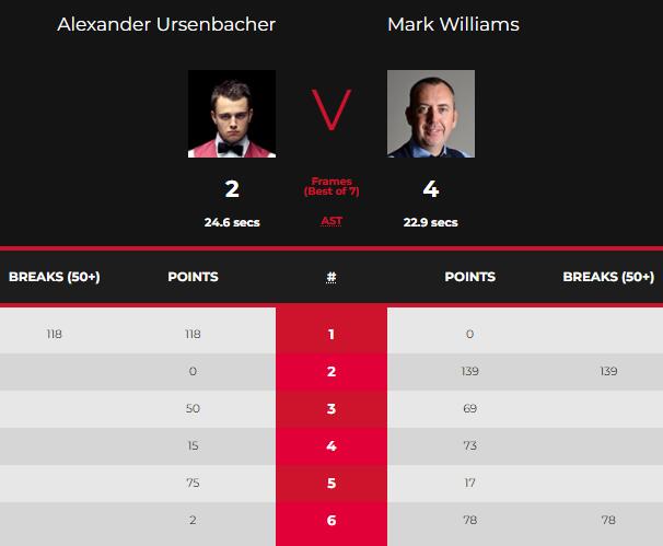 第四局,威廉姆斯再次凭借出色把握机会的能力拿到73分并以73:15拿下此局比赛的胜利3-1领先尤森巴赫率先拿到赛点。第五局,尤森巴赫以75:17拿下此局比赛的胜利2-3落后威廉姆斯。第六局,威廉姆斯单杆78分以78:2拿下此局4-2淘汰尤森巴赫晋级第三轮比赛中。