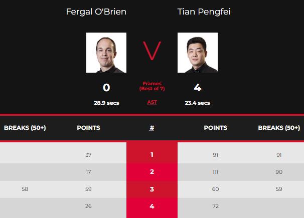 第三局,虽然奥布莱恩凭借单杆58分的表现拿到了59分,但田鹏飞依然凭借单杆59分的表现60:59上演单局绝杀从而以3-0领先奥布莱恩率先拿到了个人在本场比赛中的赛点。第四局,田鹏飞获得多次上手机会并以72:26拿下此局4-0横扫奥布莱恩晋级。