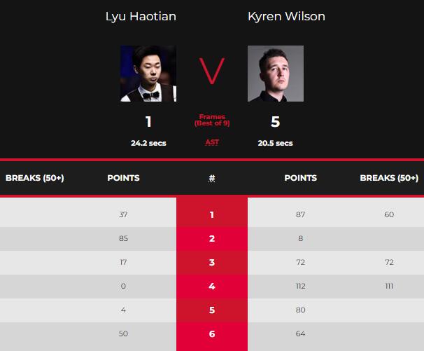 在1号球台,吕昊天对阵的是赛会8号种子K-威尔逊。比赛中,吕昊天发挥一般。首局,K-威尔逊凭借单杆60分,以87(60)-37先胜一局。第二局,吕昊天通过多次上手,以85-8将大比分扳为1-1平。不过此后,吕昊天几乎没再得到什么机会,K-威尔逊则是凭借1杆破百和1杆70+,以72(72)-17、112(111)-0、80-4和64-50连胜4局,大比分5-1轻松晋级第二轮。