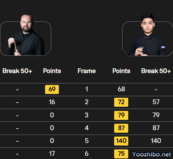 北京时间1月30日,2024斯诺克德国大师赛第2轮中,马克-乔伊斯对阵斯佳辉,最终,斯佳辉借单杆打出57分、79分、87分和140分,总比分5-1轻取对手马克-乔伊斯,成功晋级下轮。