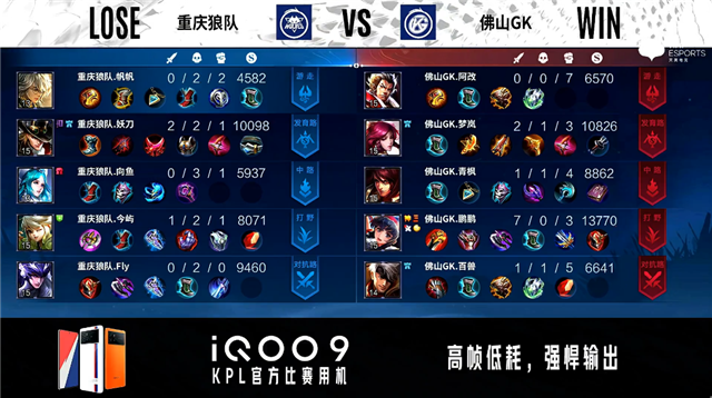 双方常规开局。2分10秒佛山GK拿下暴君。5分15秒佛山GK拿下主宰。6分33秒佛山GK拿下暴君。8分33秒佛山GK击杀马可波罗并摧毁发育路二塔。10分18秒暴君处团战佛山GK打出1换4。10分47秒佛山GK摧毁敌方中路外塔。11分16秒重庆狼队对抗路击杀伽罗。12分27秒佛山GK击杀王昭君并摧毁发育路高地塔。14分45秒暴君处团战佛山GK打出1换2。14分58秒佛山GK团灭对手,15分14秒佛山GK摧毁敌方水晶拿下比赛。