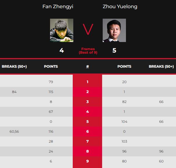 第七局,周跃龙进攻又失误,范争一单杆20分中断,周跃龙48分反超,接着61-24再度失误,但范争一机会不多,周跃龙追到3-4。第八局,范争一17分中断,周跃龙强势逆转再胜一局,4-4追平。决胜局,周跃龙远台先上手,顺利拿下,5-4绝杀。