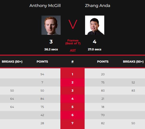 第一局,麦克吉尔以94-20拿下。第二局,张安达长台上手打出单杆52分,麦克吉尔单杆6分,麦克吉尔打进红球黄球不进,张安达再次上手拿下第二局。第三局,麦克吉尔单杆50分,拼顶袋不进,张安达单杆83分上演单局逆转。第四局,麦克吉尔打出单杆64分,以84-21拿下。双方2-2战平。