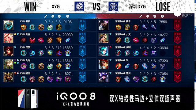 2分49秒,深圳DYG蒙犽击杀太乙真人拿下一血。3分02秒,深圳DYG控下暴君。3分35秒,XYG控下先知主宰。4分40秒,深圳DYG破掉XYG下一塔,XYG上路越塔击杀关羽。6分19秒,XYG破掉深圳DYG下一塔,随后深圳DYG破掉XYG上一塔。7分02秒,野区团,双方最终1换1。7分35秒,深圳DYG控下暴君。8分02秒,深圳DYG破掉XYG中一塔。8分26秒,深圳DYG控下先知主宰。10分21秒,中路团,双方1换1。11分52秒,双方团,XYG击杀盾山,深圳DYG小兵破掉XYG上二塔。12分34秒,XYG控下暗影暴君。14分40秒,双方团战2换2,关羽拿下双杀。16分23秒,深圳DYG小兵摧毁XYG下二塔。17分51秒,XYG击杀蒙犽。18分30秒,XYG控下暗影主宰,随后击杀盾山并破掉深圳DYG中一塔。19分30秒,XYG破掉深圳DYG上二塔。19分54秒,上路团,XYG打出0换5团灭对手。20分16秒,XYG上路一波摧毁深圳DYG水晶率先拿到赛点。