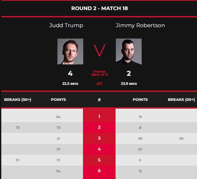 本场比赛再度交锋,特鲁姆普还是优势明显,吉米-罗伯逊基本上没有给世界第一制造什么压力。比赛一开始,特鲁姆普率先发力,罗伯逊则是慢热。第一局,特鲁姆普通过几次上手,64-15先胜一局,1-0取得开门红。第二局,特鲁姆普单杆73分制胜,73-8再胜一局,2-0领先。第三局,开场连输两局之后,罗伯逊找到一些进攻手感,他打出单杆69分,69-21扳回一局,比分追成1-2。