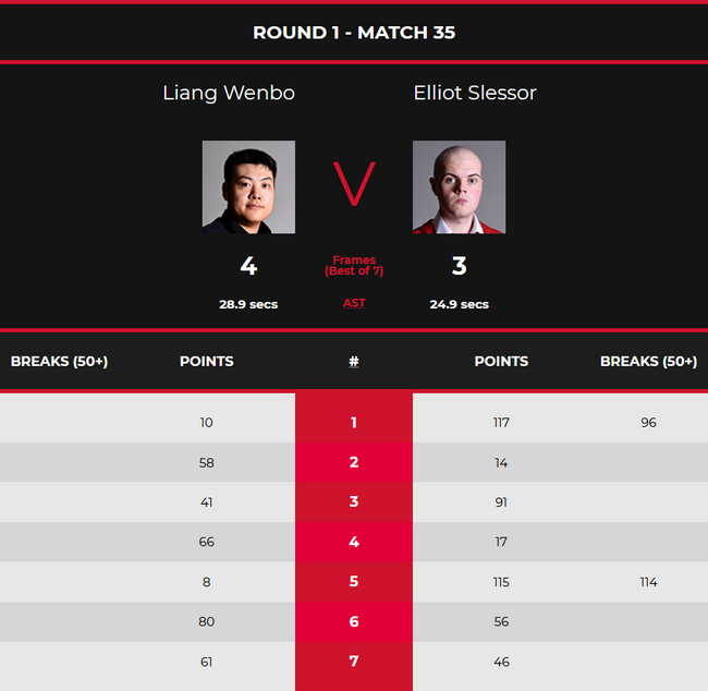 本场比赛,梁文博没有1杆单杆50+,而斯莱塞却是在第1和第5局,分别打出了单杆96分和单杆114分的单杆破百。不过由于关键球把握得更好一些,最终,梁文博以10-117(96)、58-14、41-91、66-17、8-115(114)、80-56和61-46,大比分4-3逆转晋级正赛。其中,第5局双方重摆过1次。