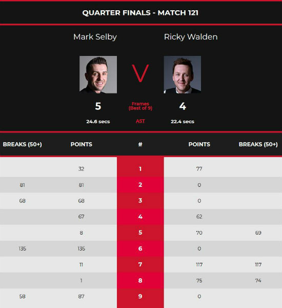 比赛进入决胜局第九局,塞尔比率先拼进红球上手,并最终凭借单杆58分的表现以5-4绝杀沃顿成功挺进苏格兰公开赛半决赛。