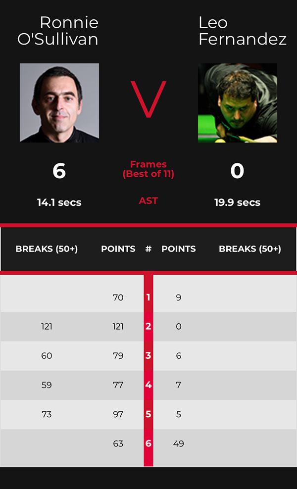 2号种子奥沙利文在最后一个时间段登场,对阵业余选手费尔南德斯。比赛过程毫无对抗可言,奥沙利文打出1杆破百和3杆50+,直接以6-0的比分取胜。比赛时间仅为100分钟,奥沙利文的平均出杆时间达到14.1秒。