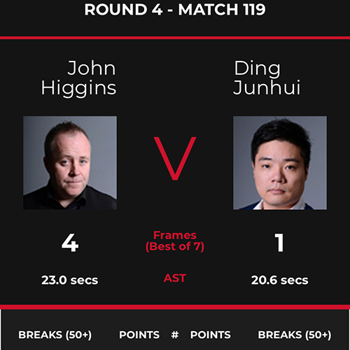 第四局,希金斯开球漏出长台机会,然而,丁俊晖在打进右侧底袋红球上手后,没能扩大领先优势,仅拿到单杆11分就出现重大失误——击打蓝球时红球落袋,被罚5分。希金斯拼进红球上手,单杆拿下66分,以71-11再胜一局,大比分3-1拿到赛点。