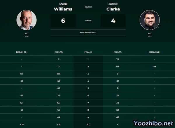 北京时间11月30日,2023斯诺克英锦赛第2轮中,马克-威廉姆斯对阵詹姆-克拉克,最终,马克-威廉姆斯凭借单杆打出138分、55分、67分、107分、55分和100分,总比分6-4击败对手詹姆-克拉克,顺利晋级八强席位。