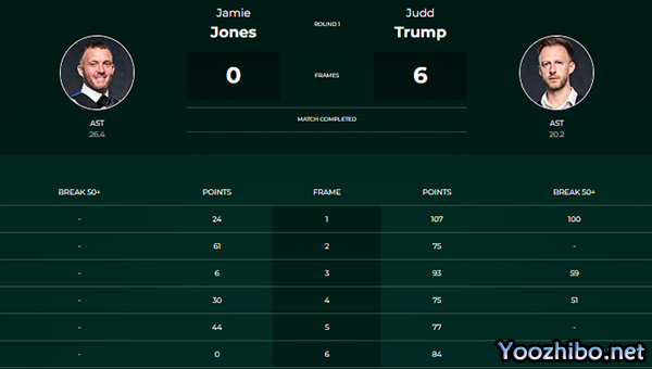 第六局,琼斯率先在比赛中出现严重的失误。特鲁姆普抓住机会打进左侧中袋红球成功获得上手的机会。最终,特鲁姆普以84:0拿下此局比赛的胜利从而以6-0横扫琼斯成功晋级本届英锦赛的八强席位之中。