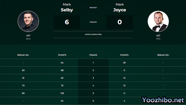 第一局两人打得还算胶着,乔伊斯错失机会,塞尔比多次上手64-39险胜,大比分1-0。第二局,塞尔比状态不错,打出了单杆82分、88-0零封,2-0领先。第三局和第四局,塞尔比又连续打出了单杆61分和单杆75分、轻松又连赢两局4-0领先。
