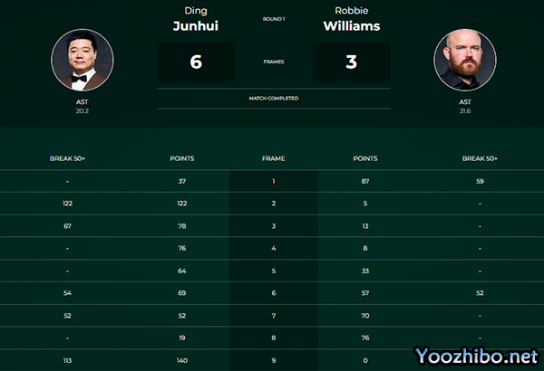 第一局上来,威廉姆斯的状态非常不错,打出了单杆59分,87-37先下一城,大比分1-0领先。第二局,丁俊晖迅速还以颜色,轰出单杆122分轻松一杆制胜,1-1。第三局,丁俊晖打出单杆67分、78-13轻松再下一城,2-1反超。第四局,丁俊晖多次上手76-8拿下,3-1领先进入休息。
