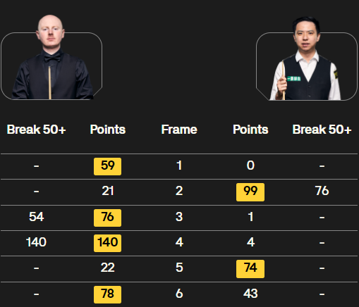 在比赛中,麦克吉尔展现出了出色的竞技状态。他打出了1杆破百(单杆140分)和1杆50+(单杆54分),显示出其强大的进攻火力。而肖国栋虽然也打出了一杆50+(单杆76分),但在整体表现上未能与麦克吉尔相抗衡。最终,麦克吉尔以4-2的比分赢得了这场比赛的胜利。
