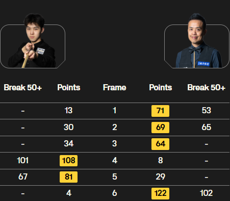 关键局:在比赛的关键时刻,傅家俊展现出了老将的风采,多次利用对手的失误进行反击,并成功打出了几杆高分。据报道,傅家俊在比赛中分别打出了单杆65、53分和102分的高分,这些精彩的表现成为了他最终取胜的关键。