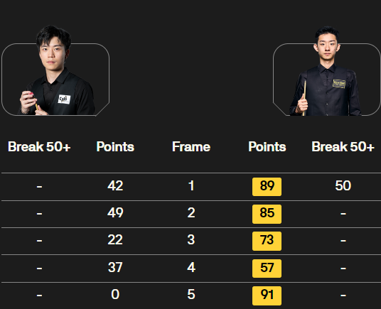 第一局:双方打得较为谨慎,互有零碎得分。关键时刻吴宜泽上手,凭借单杆 50 分,以 89:42 获胜,取得比赛的开门红。