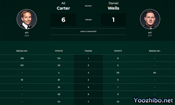 北京时间11月8日,2023斯诺克国际锦标赛第4轮中,阿里斯特-卡特对阵丹尼尔-威尔斯,阿里斯特-卡特凭借单杆打出106分、107分和81分,总比分6-1击败对手丹尼尔-威尔斯,晋级下轮。