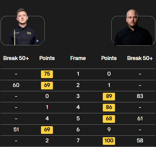 凯伦 - 威尔逊在本局中轰出单杆 51 分,以 69-9 拿下这一局,将比分追至 3-3 平,把比赛拖入决胜局。