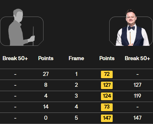 第5局:在决定性的一局中,墨菲轰出了个人职业生涯的第10杆147满分杆,这是本赛季斯诺克比赛中的第12杆147,也是历史上第214杆147。这一杆满分杆不仅为墨菲赢得了本局比赛的胜利,也以5-0的总比分横扫周金豪,成功晋级32强。