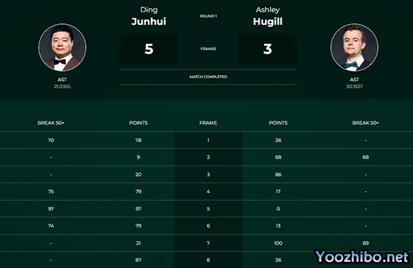 比赛第一局,丁俊晖单杆70分,实现超分,阿什利.赫吉尔通过做斯诺克追回4分,不过仍然未能逆转本局。第二局,赫吉尔打出一杆68分,扳平比分。第三局,赫吉尔多次上手,86–20赢下本局,将比分反超。第四局,丁俊晖打出一杆75分。上半场比赛结束,两位球员2–2打平。