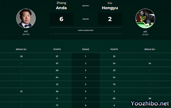 第七局,刘宏宇单杆轰出68分以80:0拿下此局2-5落后张安达。第八局,张安达凭借77:6的表现拿下此局比赛的胜利并以6-2横扫刘宏宇进决赛。