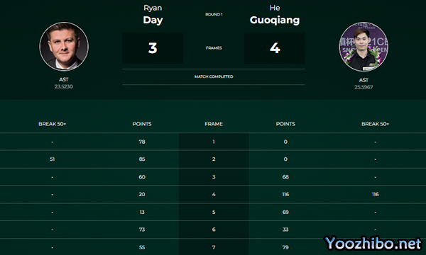 第三局,贺国强凭借68:60的单局绝杀表现以1-2落后瑞恩戴。