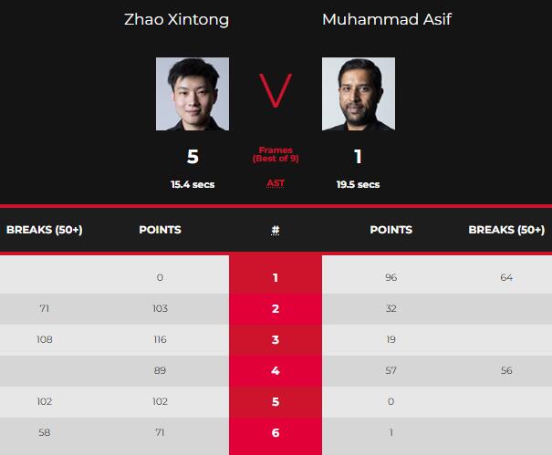 比赛中,阿西夫在首局凭借单杆64分,以96(64)-0先胜一局。但此后,赵心童凭借2杆破百和2杆50+,以103(71)-32、116(108)-19、89-57(56)、102(102)-0和71(58)-1连胜5局,大比分5-1逆转,成为首位晋级正赛的选手。
