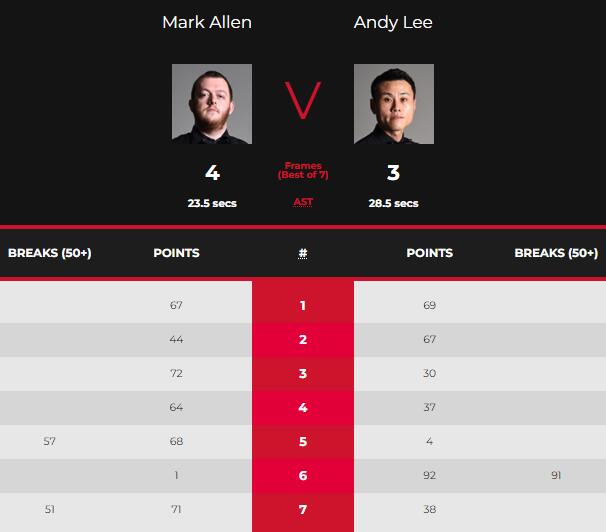 第四局,艾伦凭借出色把握机会的能力以64:37拿下此局比赛的胜利从而以2-2艰难扳平比分。第五局,艾伦凭借单杆57分的表现以3-2反超李俊威率先拿到本场比赛的赛点。第六局,李俊威单杆91分92:1拿下此局比赛的胜利从而以3-3战平艾伦迎来双赛点。第七局,艾伦单杆51分71:38拿下此局4-3逆转绝杀中国球员李俊威晋级16强。