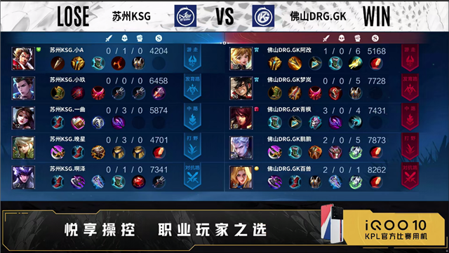 第一局开局双方选择换线。3分钟中路团双方2换2。4分11秒苏州KSG拿下暴君。4分20秒野区团佛山DRG.GK打出0换2。5分38秒佛山DRG.GK摧毁敌方对抗路外塔。6分46秒苏州KSG摧毁敌方中路外塔。7分04秒佛山DRG.GK拿下先知主宰。8分钟佛山DRG.GK野区击杀上官婉儿。8分36秒佛山DRG.GK摧毁敌方发育路外塔。9分15秒苏州KSG拿下暴君。11分02秒佛山DRG.GK拿下暗影主宰。11分50秒佛山DRG.GK摧毁敌方对抗路二塔。12分32秒苏州KSG拿下暗影暴君。12分49秒佛山DRG.GK高地处击杀公孙离。13分23秒佛山DRG.GK摧毁敌方中路外塔。14分05秒苏州KSG中路击杀老夫子。14分55秒苏州KSG拿下暗影暴君,中路团双方2换2。16分36秒苏州KSG拿下暗影主宰。17分35秒双方中路1换1。19分04秒苏州KSG摧毁敌方中路二塔。19分20秒苏州KSG高地处打出0换3团灭对手。19分39秒苏州KSG摧毁敌方水晶拿下比赛。