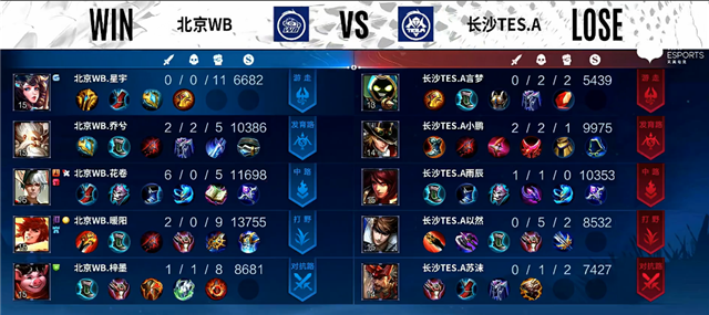 2分16秒赵云拿下暴君。2分40秒上路团战,马可波罗拿下一血。4分钟野区团战,北京WB打出0换4,嬴政拿下四杀。5分钟老夫子推掉下路一塔。6分19秒老夫子推掉上路一塔,裴擒虎拿下主宰。7分33秒马可波罗推掉上路一塔。8分钟河道团战,北京WB打出0换2。8分20秒嬴政推掉中路一塔。9分钟裴擒虎拿下暴君。10分18秒裴擒虎拿下暴君。11分10秒老夫子推掉下路高地塔。12分31秒裴擒虎拿下主宰。13分20秒裴擒虎推掉上路高地塔。14分30秒裴擒虎拿下暴君。15分30秒北京WB推掉水晶拿下本场比赛胜利。