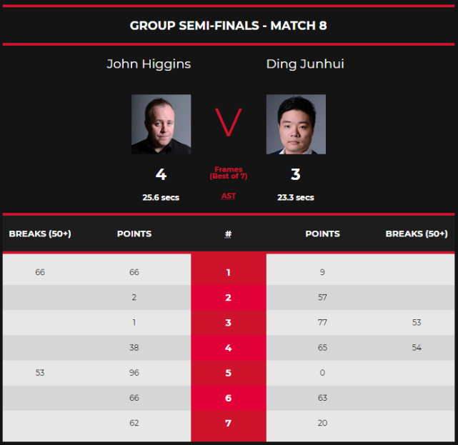 第一局丁俊晖仅得9分就中断进攻,希金斯打出单杆66分先拔头筹,第二局希金斯两次打进红球都没能继续连接,丁俊晖多次上手57-2扳平比分,两人都没有手感,出现简单失误,第三局丁俊晖打出单杆53分77-1再赢一局,第四局丁俊晖打出单杆54分65-38胜出,3-1赛点。