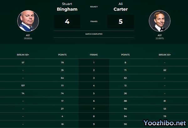 北京时间10月11日,2023斯诺克武汉公开赛第3轮中,宾汉姆对阵阿里斯特-卡特,阿里斯特-卡特凭借单杆打出62分、81分、53分和79分,大比分5-4险胜宾汉姆,晋级下轮。
