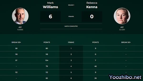 24直播网讯 北京时间9月21日,2023斯诺克国际锦标赛资格赛中,威廉姆斯对阵丽贝卡-肯娜,威廉姆斯凭借两杆破百和两杆50+,连下6局,大比分6-0横扫英格兰女将丽贝卡-肯娜,轻松晋级正赛。