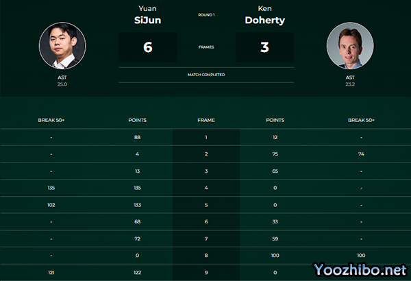 第一局,袁思俊凭借成功的防守,多次上手零碎得分,88:12获胜,取得比赛的开门红!第二局,达赫迪凭借单杆74分,75:4扳回一局,双方的局分来到1:1平。第三局,肯达赫迪凭借成功的防守,多次上手零碎得分,65:13拿下,连赢两局局分2:1领先。第四局,袁思俊突然爆发,轰出单杆135分清台,把局分追到2:2平。