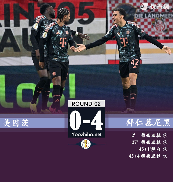 24直播网讯 北京时间10月31日凌晨3点45分,德国杯第2轮,拜仁慕尼黑客场对阵美因茨。上半场,穆西亚拉打进三球完成帽子戏法,萨内进球建功,凯恩贡献一次助攻。半场战罢,拜仁慕尼黑暂4-0美因茨;下半场,穆勒替补登场,戴尔伤退,双方再无进球出现。全场比赛结束,拜仁慕尼黑4-0美因茨!