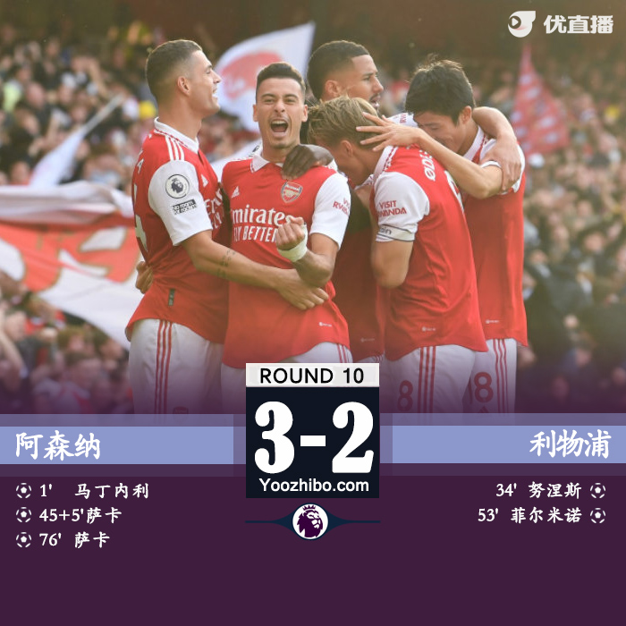 24直播网讯北京时间10月9日23点30分,英超第10轮焦点战阿森纳主场对阵利物浦。上半场开场1分钟马丁内利闪击破门,努涅斯铲射扳平比分,迪亚斯伤退,萨卡补时阶段打进一球。下半场,厄德高错失良机,菲尔米诺再度扳平比分,热苏斯造点,萨卡点射破门,全场比赛结束,阿森纳3-2利物浦。