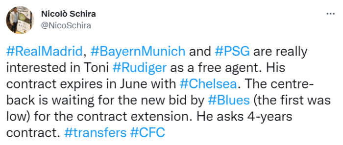 不过吕迪格还在等待切尔西给他新的报价(他认为首份报价的薪水很低),同时吕迪格要求签下4年合同。
