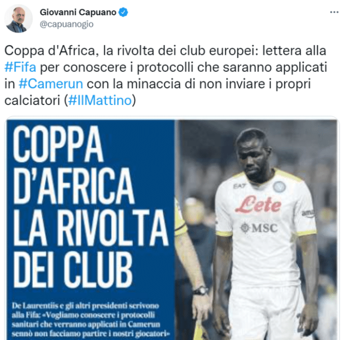来源:24直播网12-17 10:1024直播网12月17日讯 据记者GiovanniCapuano报道,有一些欧洲俱乐部致信国际足联,威胁不放球员参加非洲杯。