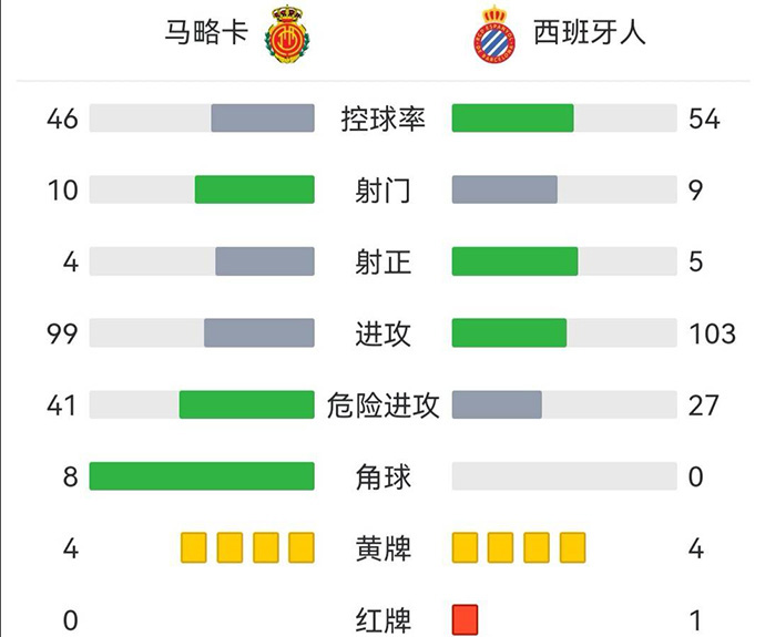 全场比赛结束,马洛卡2-1西班牙人。
