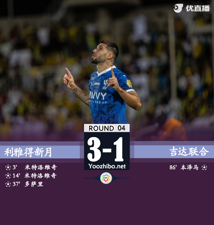 24直播网讯 北京时间9月22日凌晨2时,沙特联第4轮,利雅得新月主场迎战吉达联合,上半场,鲁本-内维斯助攻米特洛维奇头球破门,洛迪造点,米特洛维奇点射完成双响,随后鲁本内维斯再次送出助攻,多萨里破门再下一城,本泽马进球被吹越位,半场战罢,利雅得新月暂3-0吉达联合;下半场,吉达联合加强进攻,本泽马破门扳回一球,补时最后时刻,本泽马补射破门,可惜因为越位再次被吹!全场比赛结束,利雅得新月3-1吉达联合!