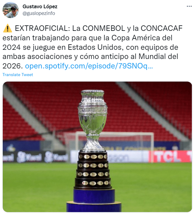 24直播网04月08日讯 据美国记者GustavoLopez报道,南美足联和中北美足联正在商讨由美国主办2024年的美洲杯。