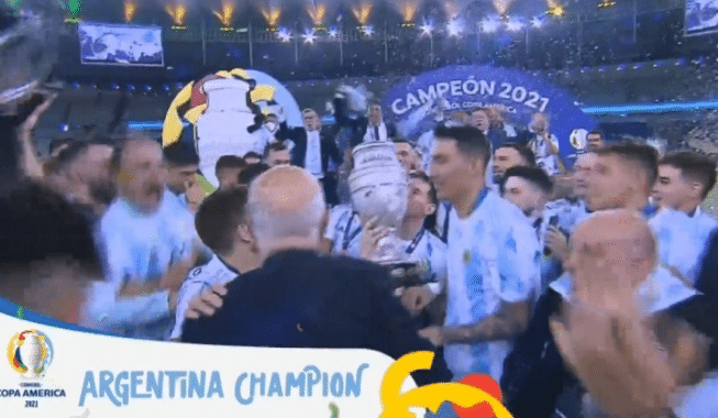 捧杯时刻之前是巴西队领取亚军奖牌,随后是阿根廷队球员们领取奖牌,作为队长的梅西最后一个登场,他荣耀捧杯,恭喜!