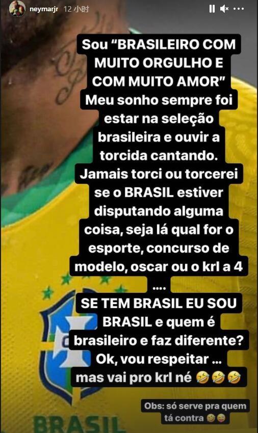 针对一些巴西人支持阿根廷的做法,内马尔今日在Instagram上写道:“我是充满自豪和爱的巴西人。我的梦想一直是成为巴西国家队的一员,想听粉丝们的歌。”