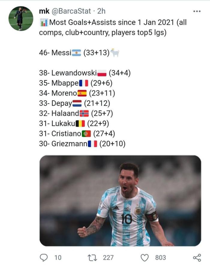 Football Transfers统计了2021年至今球员在各项赛事中的参与进球数量(进球加助攻),梅西46球高居首位,莱万38球暂居次席。
