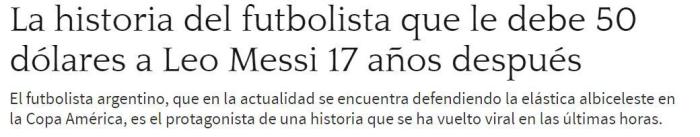 来源:24直播网07-04 11:3724直播网讯 据西班牙媒体《阿斯报》报道,阿根廷报纸《奥莱报》出版的一本名为《梅西,不完整的天才》一书中披露,2004年梅西随阿根廷国青队参加比赛时,曾被队友阿尔瓦拉多领走了50美元的补贴,这笔钱至今没还。