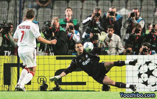 首轮点球,AC米兰的塞尔吉尼奥是第一位球员主罚,杜德克在球门线不断弹跳而干扰塞尔吉尼奥,塞尔吉尼奥可能受到影响,皮球一飞冲天,完全不中球门。利物浦第一位主罚球员是哈曼,该时他的脚已有骨折,仍射入点球。迪达成功预计哈曼射球方向,但不能扑中。