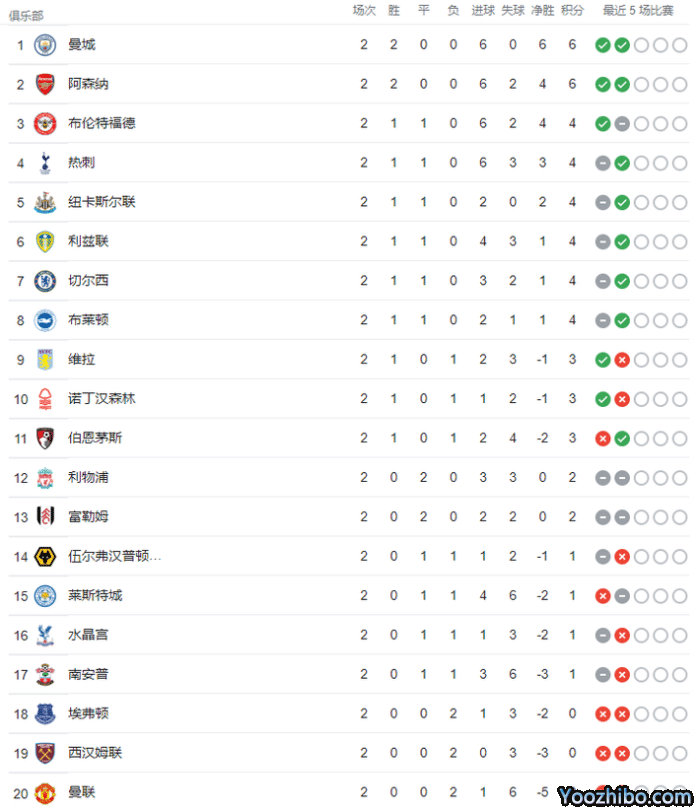 目前,曼城阿森纳两连胜分别排名第一和第二,布伦特福德第三,热刺第四,切尔西1胜1平第七,利物浦2平第12,曼联2负倒数第一。