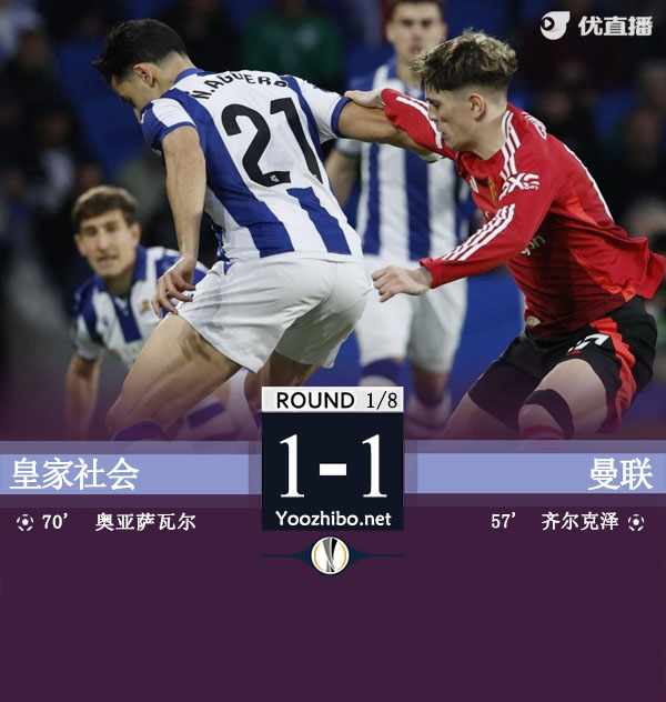 24直播网讯 北京时间3月7日凌晨1:45,欧联杯1/8决赛首回合,曼联在阿诺塔球场客战皇家社会。上半场两队均无建树,暂0-0战平;下半场加纳乔助攻齐尔克泽破门,B费送点,奥亚萨瓦尔点射扳平,最终曼联客场1-1战平皇家社会。