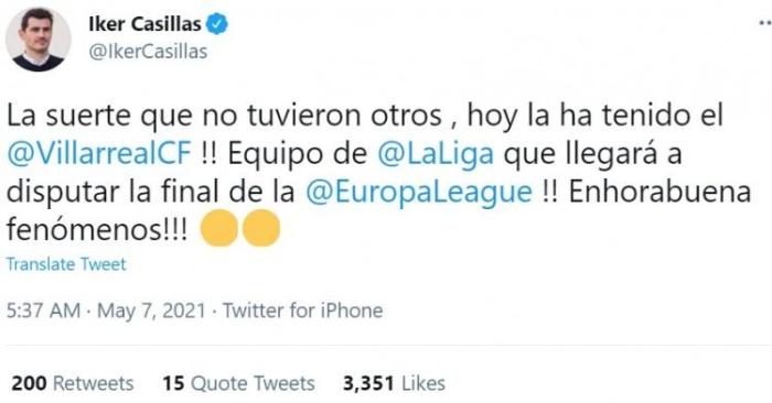 卡西利亚斯写道:“比利亚雷亚尔拥有其他人不具备的幸运,他们将代表西甲联赛参加欧联杯决赛!祝贺你们!现象级的表现!”