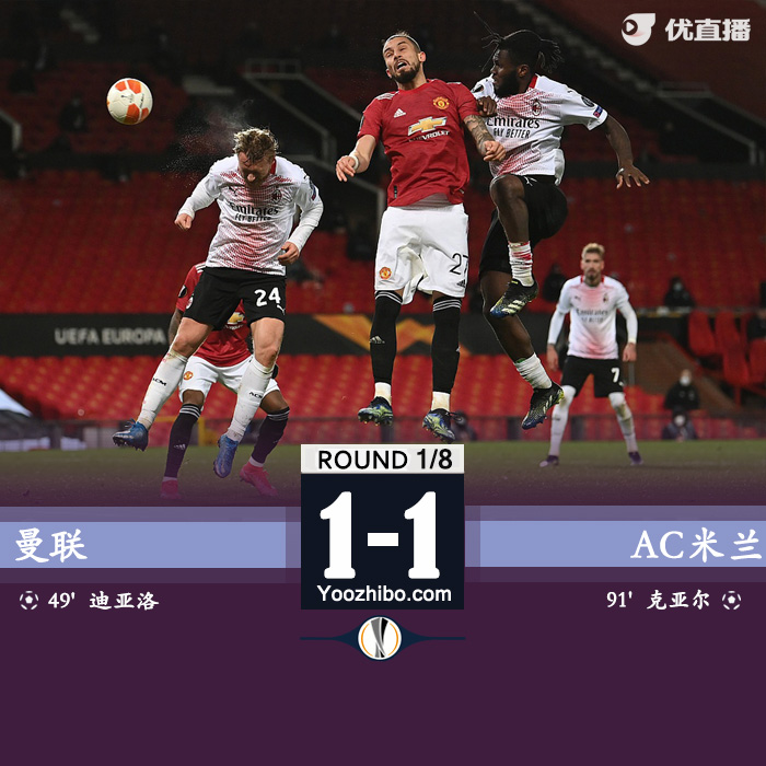来源:24直播网03-12 09:47 24直播网讯:北京时间3月12日01:55,欧联1/8决赛首回合,曼联主场迎战AC米兰。上半场莱奥和凯西的进球均被判无效,马奎尔中柱。下半场B费助攻迪亚洛头球破门,克亚尔补时扳平比分。最终,曼联1-1米兰。